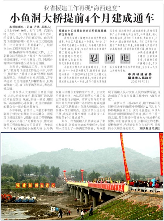 在四川汶川特大地震一周年之際,由我司對(duì)口援建的彭州小魚洞大橋正式建成通車,比計(jì)劃設(shè)計(jì)工期提前4個(gè)月,創(chuàng)造了福建在援建工作中的海西速度。經(jīng)評(píng)審主體工程實(shí)現(xiàn)零缺陷目標(biāo),向彭州人民交上了一份滿意的答卷。